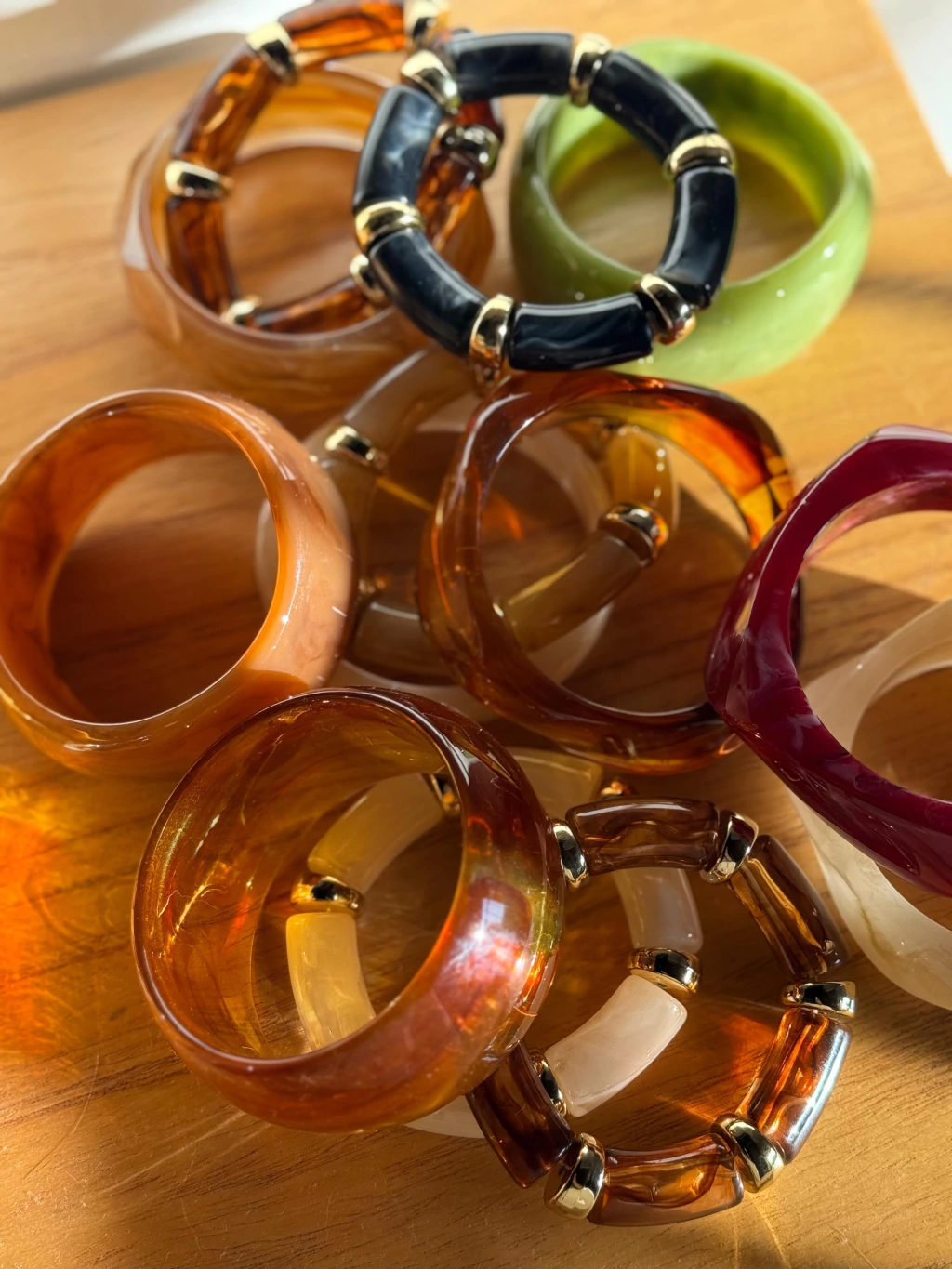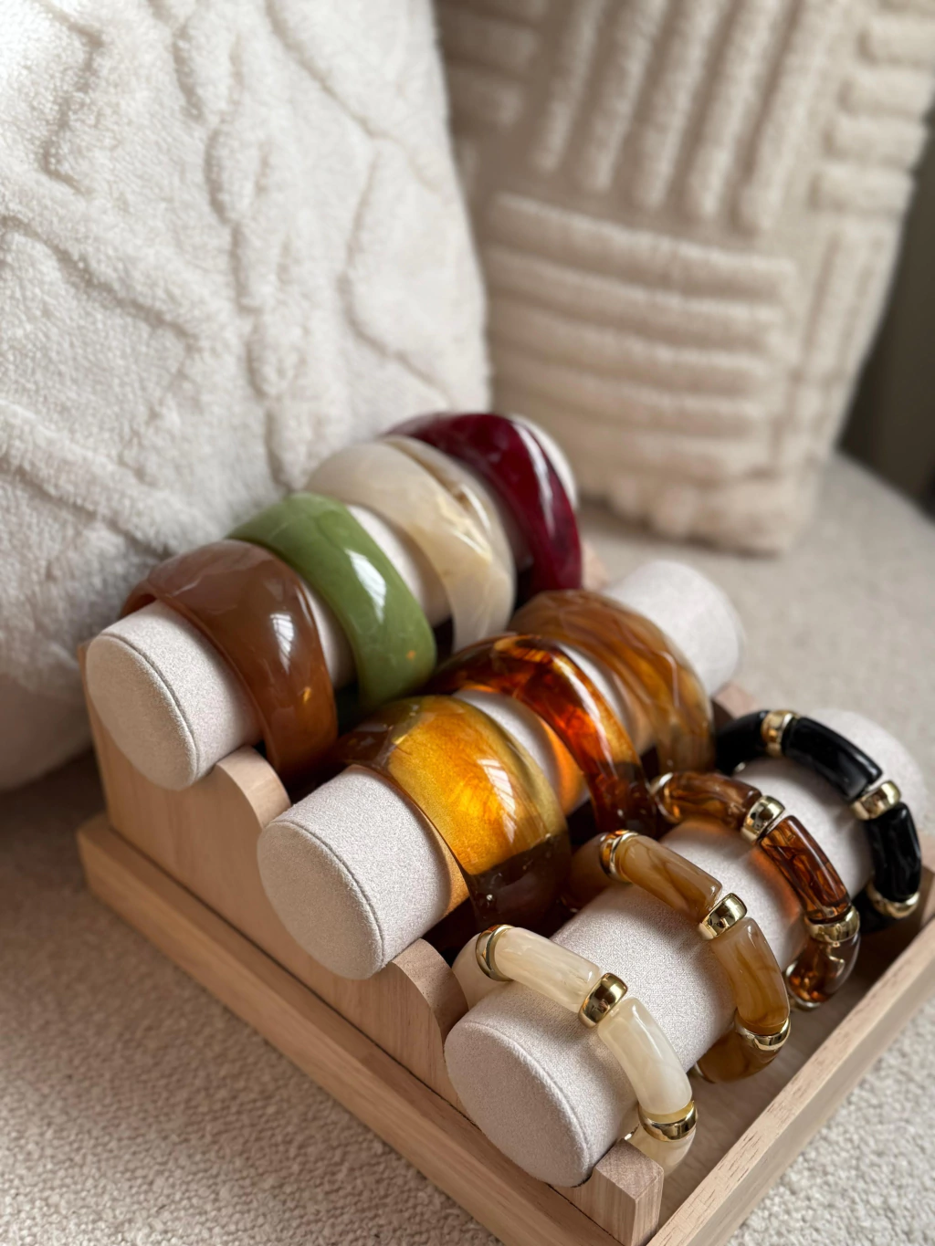 Confeccionada en resina color preto, esta pulsera destaca por su diseño orgánico que combina textura y brillo con un estilo atemporal. Su diámetro interno de 6 cm elastizado garantiza un ajuste cómodo y seguro.